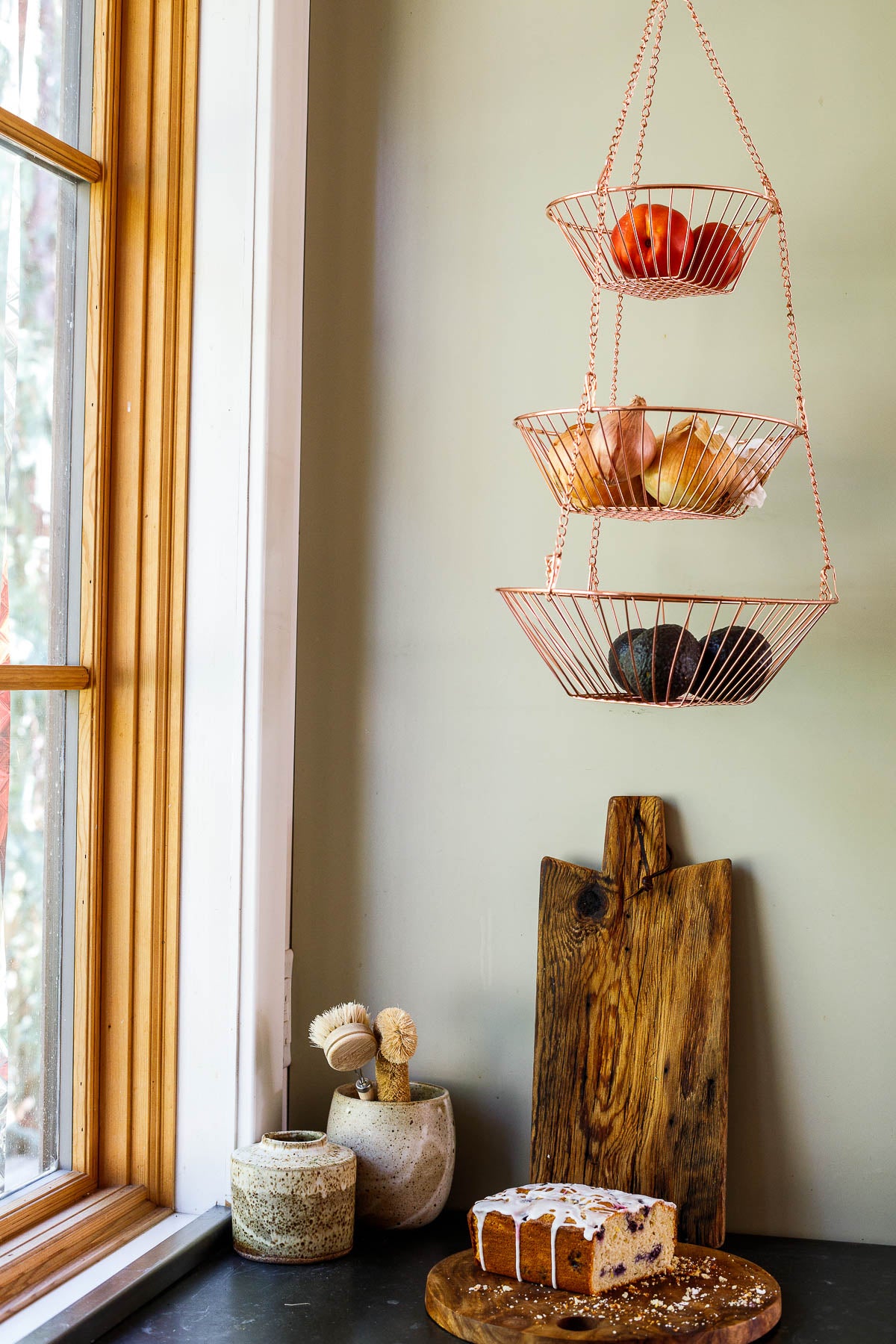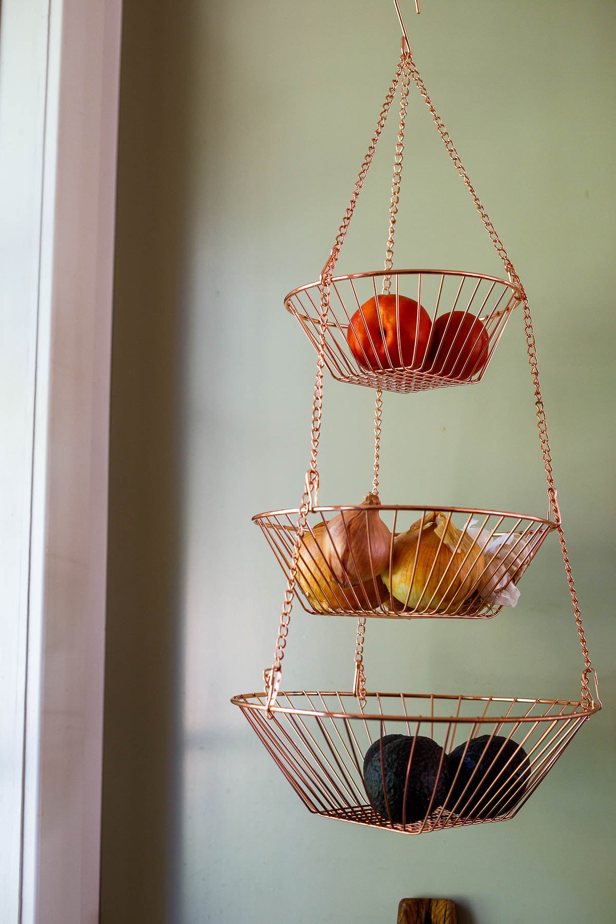 Hang this elegant copper basket or split it apart into 3 handy storage baskets. Woven steel wire construction provides durability while also adding a pleasant design piece.